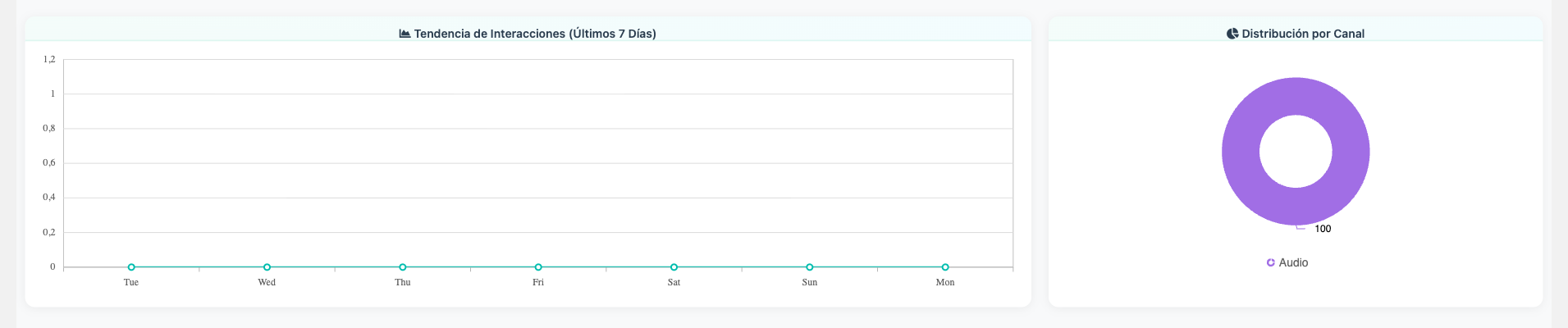 El dashboard incluye graficos interactivos que visualizan tus tendencias de datos a lo largo del tiempo y por canal.