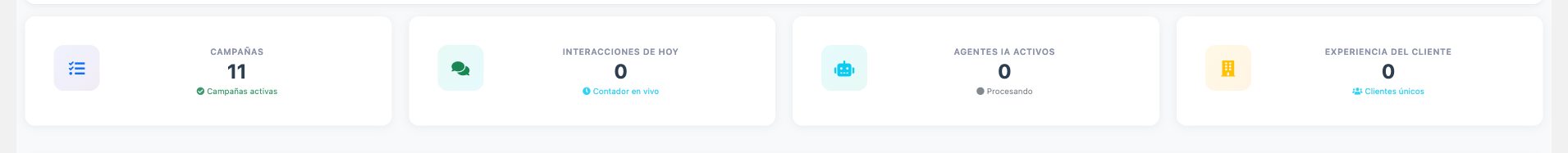 Cuatro tarjetas KPI mostrando el estado operacional: compromisos, interacciones, agentes de IA y metricas de experiencia del cliente.