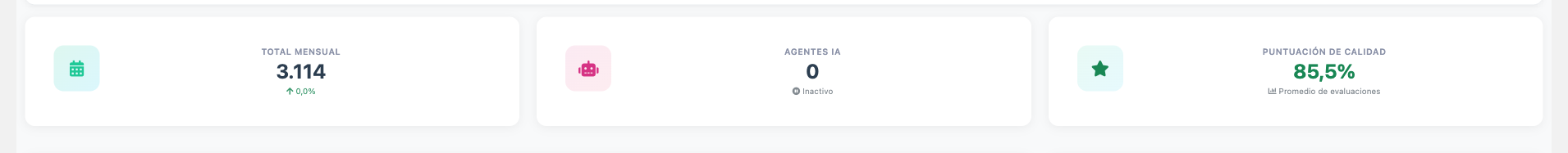 Three cards focused on business performance: monthly totals, AI agent usage, and quality scores.