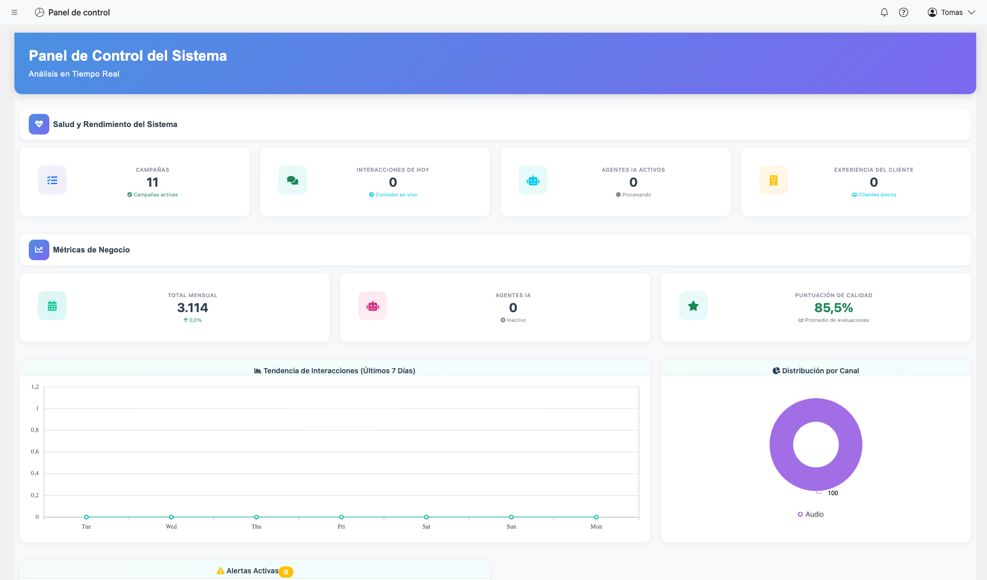 The Auralytik Dashboard is your command center for monitoring conversation analytics across all channels. It provides a real-time snapshot of system performance, business metrics, and operational health.